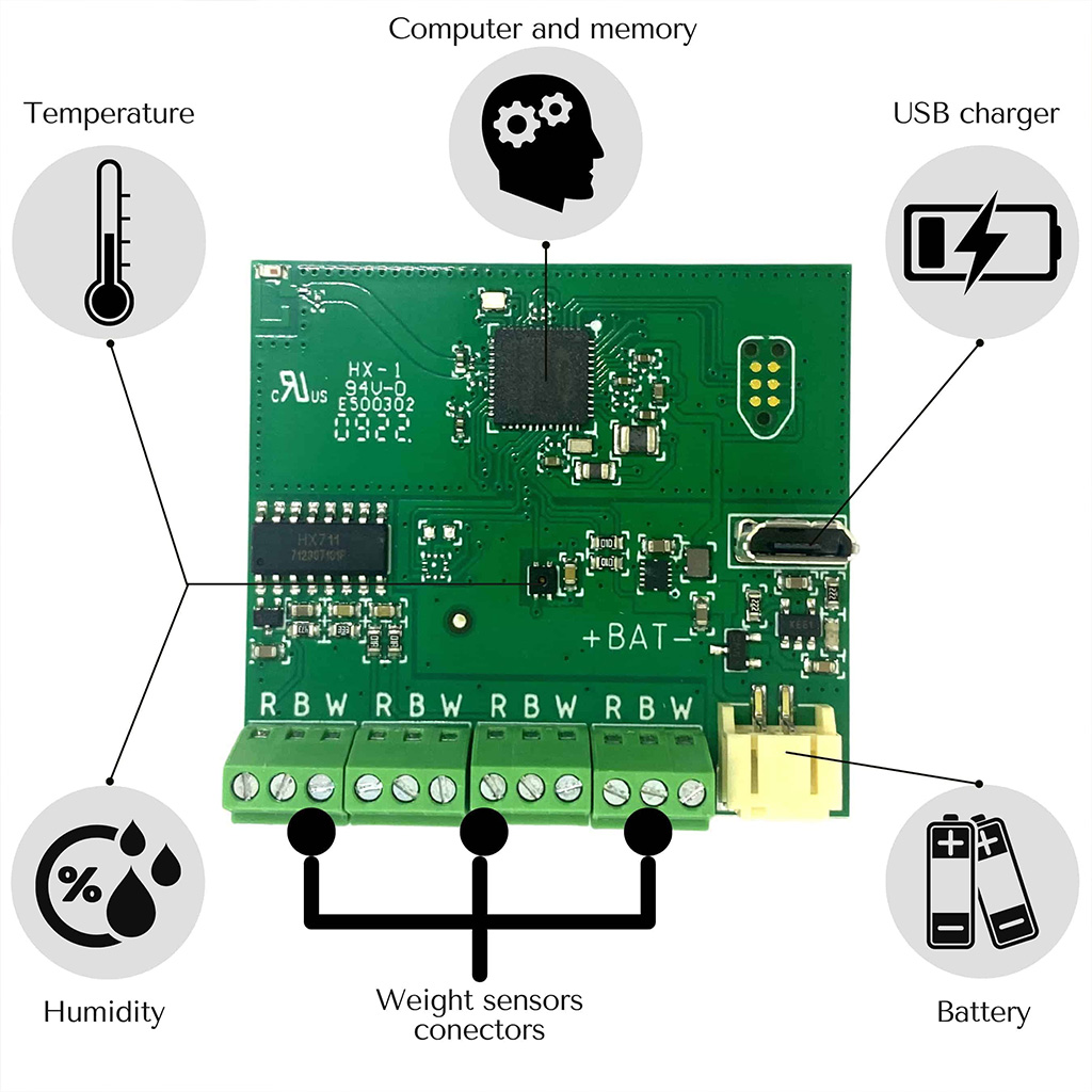 | Kommunikation | Bluetooth (Reichweite 100 m im freien Gelände, 5–50 m unter der Beute). Optional GSM-Modul (unbegrenzte Reichweite). |
