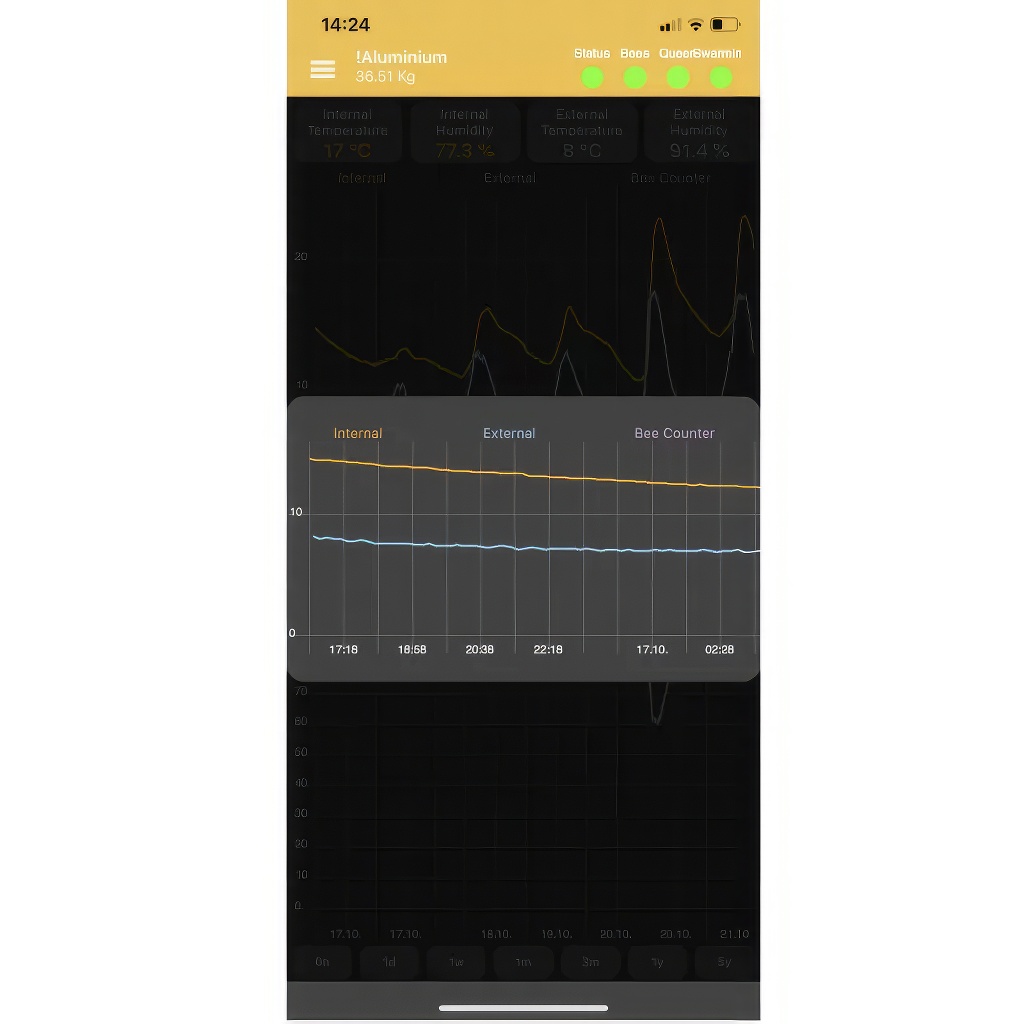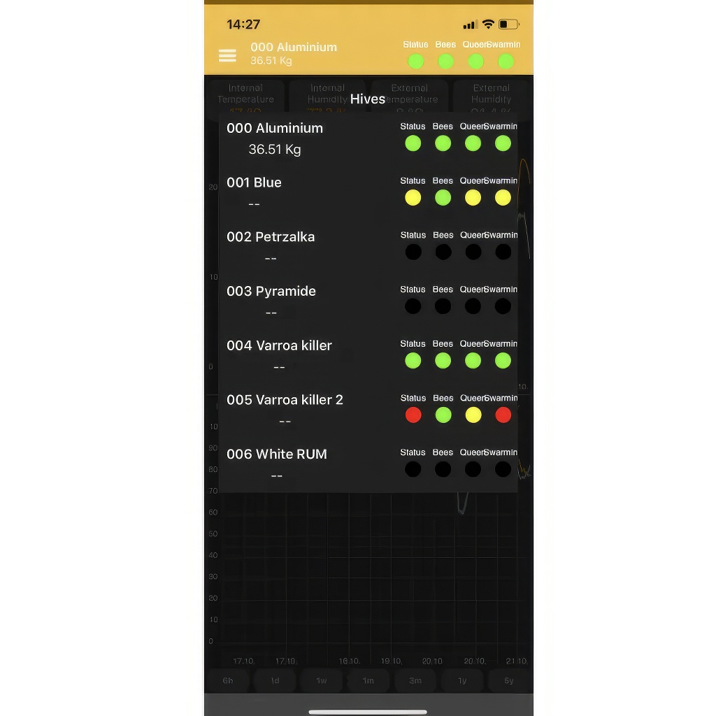 Die App Bee Hive Monitoring ist kostenlos für iPhone (iOS), Android und für den Computer über eine Weboberfläche verfügbar. Sie ist in mehrere Sprachen lokalisiert, einschließlich Tschechisch und Slowakisch. In der Grundkonfiguration kommuniziert die Waage mit dem Smartphone über Bluetooth. Wenn Sie die Daten aus der Ferne ohne Besuch des Bienenstands überwachen müssen, kann ein externes GSM-Modul nachgekauft werden, das den Zugriff auf die Daten praktisch von überall ermöglicht. In der App finden Sie übersichtliche Diagramme in langen Zeitreihen, zwischen denen Sie einfach wechseln und den täglichen, wöchentlichen und monatlichen Trachtverlauf auswerten können. Ein Vorteil ist auch der verfügbare Online-Support des Entwicklerteams aus der Slowakei, mit dem Sie Fragen und eventuelle Probleme klären können.