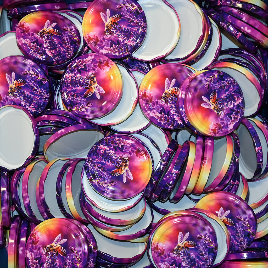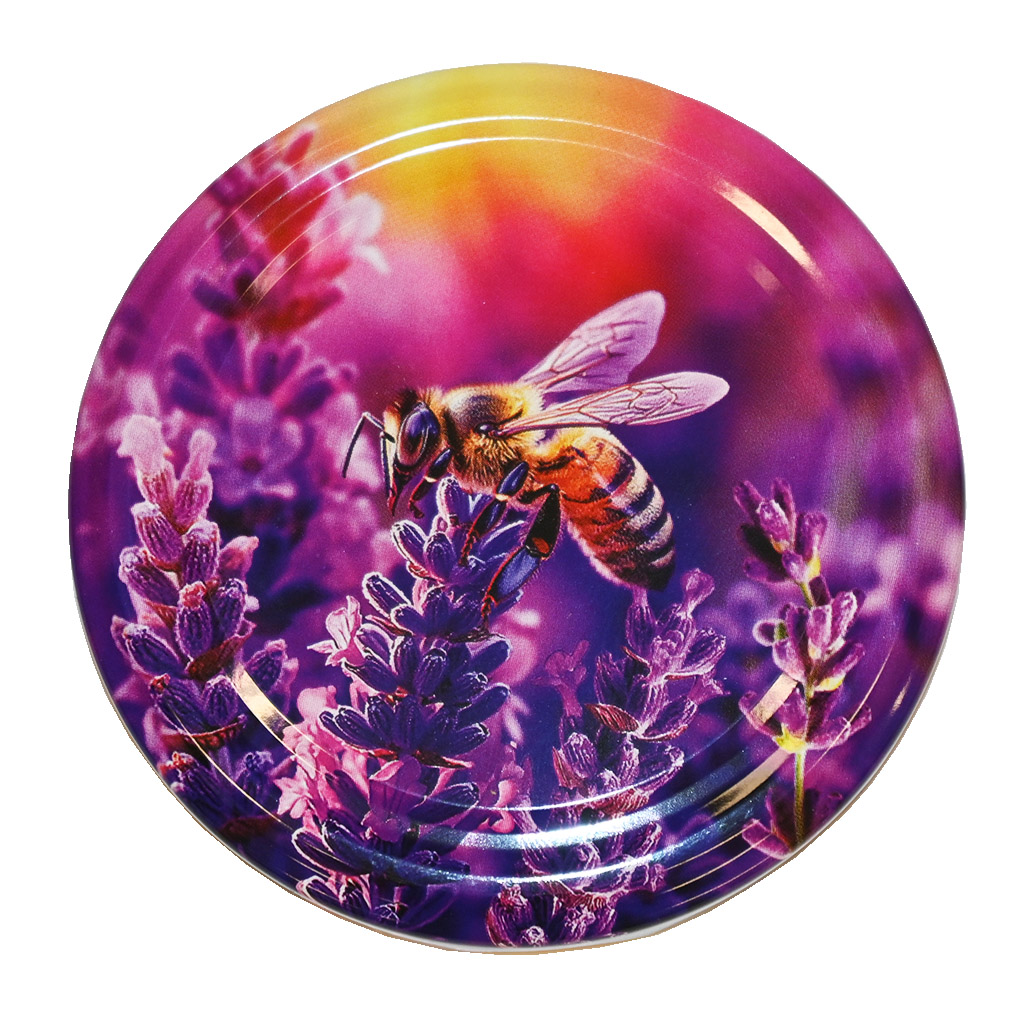 Schraubdeckel Muster Biene und Lavendel - HO17 für Gläser Biene 730 ml, Facette 720 ml, Fass 720 ml, Facette 580 ml und Facette 420 ml. Grafisch sehr schön gestalteter Deckel für Standardgläser, die für geschleuderten Honig verwendet werden. Mit diesem Deckel werden Sie Ihrem Honig sicherlich keine Schande bereiten. Die komplette Packung enthält 700 Stück.