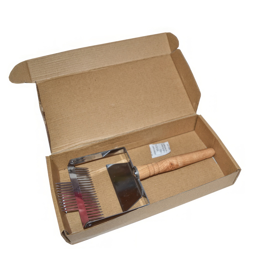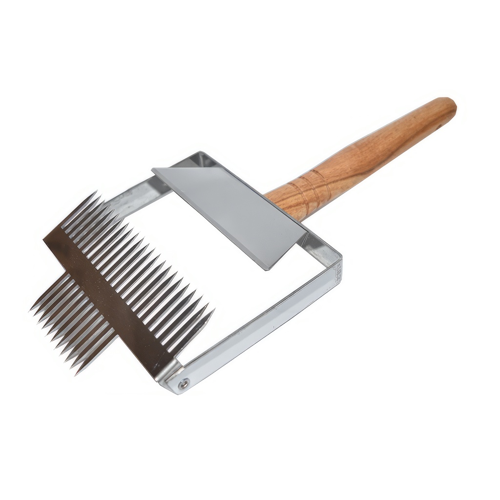 Neuheit unter den Entdeckelungsgabeln. Lasergeschnittene Gabel mit 23 Nadeln mit Führungsklinge, die das Entdeckeln erleichtert. Diese Gabel ist neu auch an der Vorderseite der Klinge mit Nadeln bestückt, damit Sie auch schwer zugängliche Stellen entdeckeln können. Lasergeschnittene Nadeln zeichnen sich durch größere Festigkeit aus, biegen sich nicht und brechen nicht. Die Gabel mit 23 Nadeln ist die breiteste aus der Gruppe der Gabeln mit Klinge, die wir derzeit anbieten, hat also die größte Arbeitsbreite. Die Arbeitsbreite der Gabel beträgt 11,5 cm.