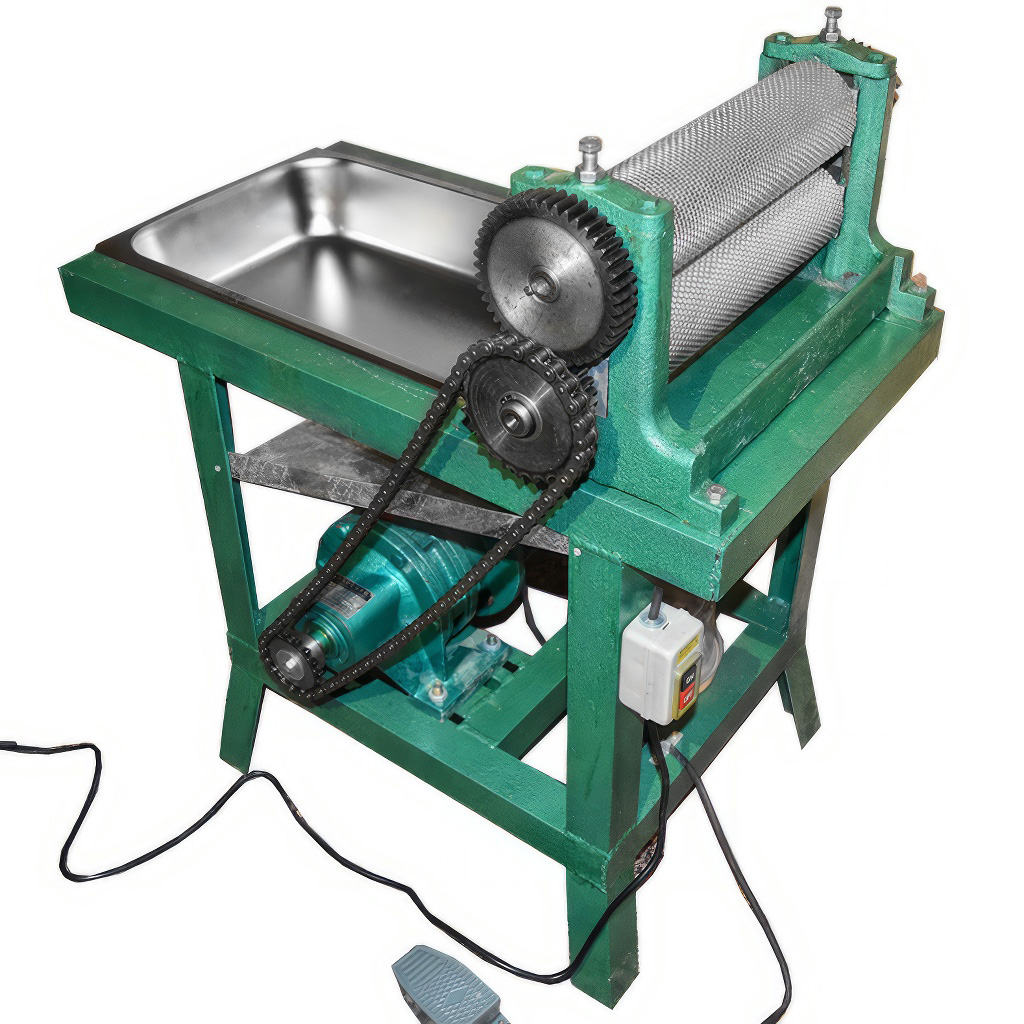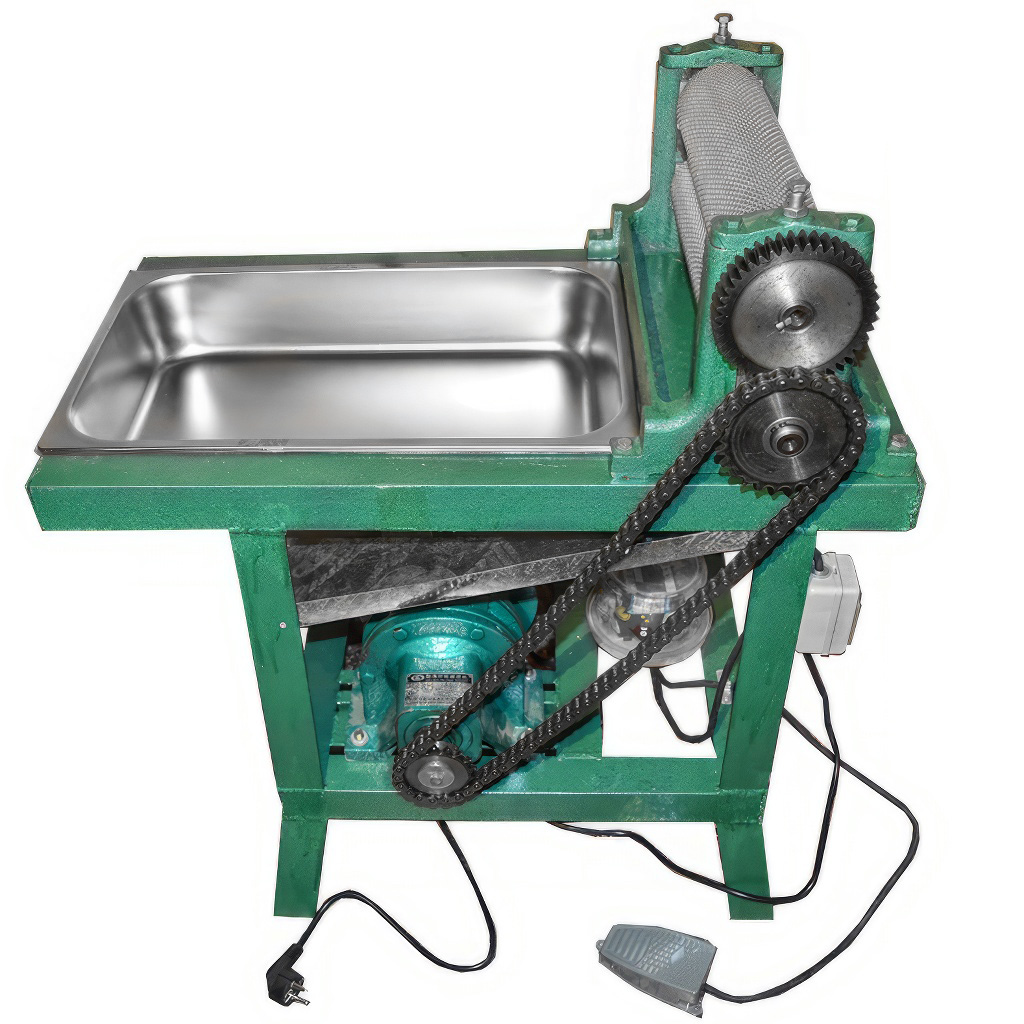 Den tragenden Teil bildet ein massiver Stahlrahmen aus L-Profilen (47 × 47 × 3 mm) mit widerstandsfähigem grünem Lack. Die Konstruktion gewährleistet Stabilität bei der Arbeit und hilft, Motorvibrationen zu dämpfen. Ein großer Vorteil für die komfortable Bedienung ist das Fußpedal, mit dem Sie die Walzen einfach starten und stoppen – die Hände bleiben so frei für die präzise Führung des Wachsbandes. Zum Gerät gehören präzise gravierte Walzen, die die typische sechseckige Zellenstruktur der Mittelwand prägen.