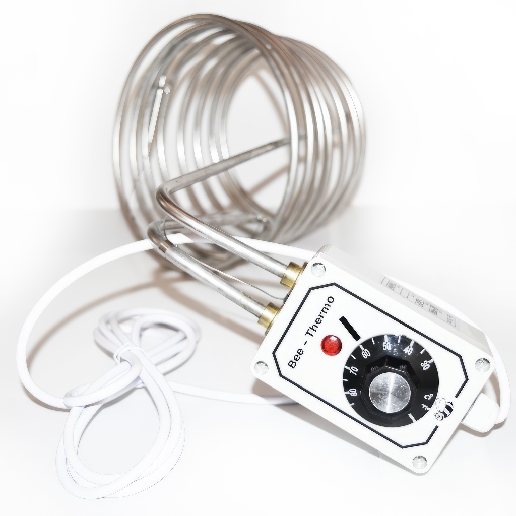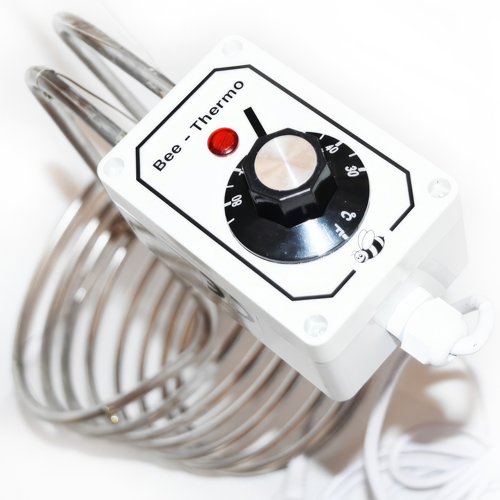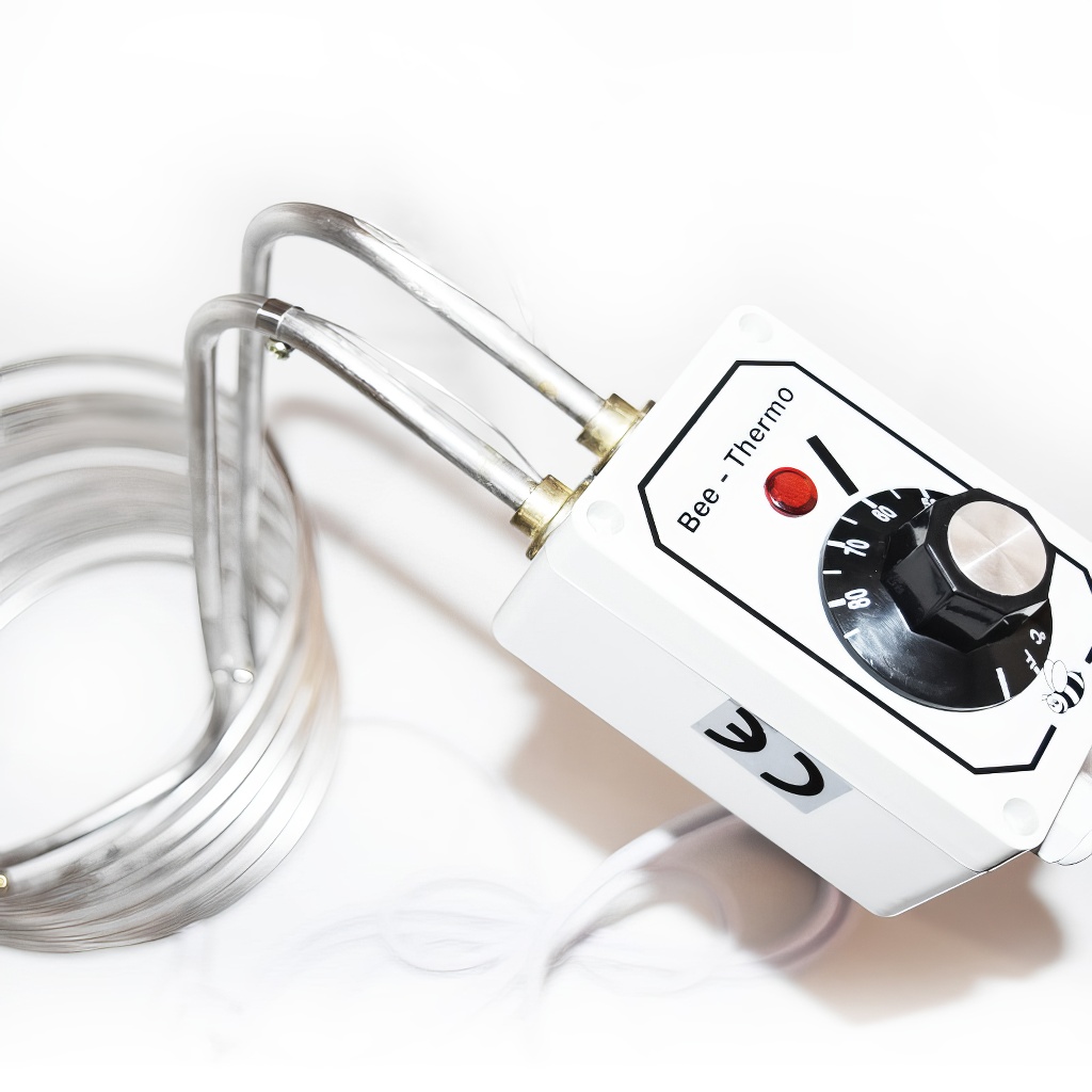 Heizspirale zum Honigerwärmen mit vergrößerter Heizfläche. Die Spirale ist mit einem Thermostat zur Temperatureinstellung ausgestattet. Dank ihrer Form kann sie an die meisten Behälter gehängt werden. Die Spirale ist zum Erwärmen von leicht kristallisiertem Honig oder schlecht fließenden viskosen Honigen bestimmt. Die Spirale ist für 230 V ausgelegt, ihre Leistung beträgt 1000 W.