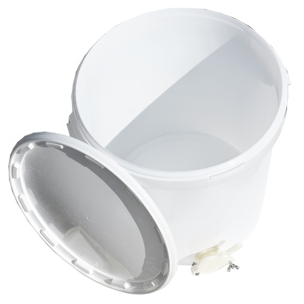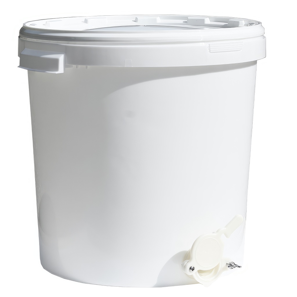 Weißer Abfüllbehälter für Honig mit Deckel und Ablasshahn aus hochwertigem Kunststoff, wodurch er sich nicht verzieht und seine Form behält. Er fasst bis zu 40 kg. Dank der einfachen Konstruktion des Ventils lässt er sich gut entleeren. Das Ventil lässt sich leicht demontieren und der gesamte Behälter samt Ventil lässt sich einfach reinigen.Das Volumen des weißen Abfüllbehälters beträgt 40 kg. Die Behälter sind für die Lagerung von Lebensmitteln bestimmt. Die Höhe des 40-kg-Behälters beträgt 37 cm, der obere Durchmesser 37 cm. Der untere Durchmesser des Behälters ist 32 cm. ISO-Volumen des Behälters 31,5 l.Foto des 40-kg-Behälters. Die Farbe des gelieferten Hahns kann abweichen.