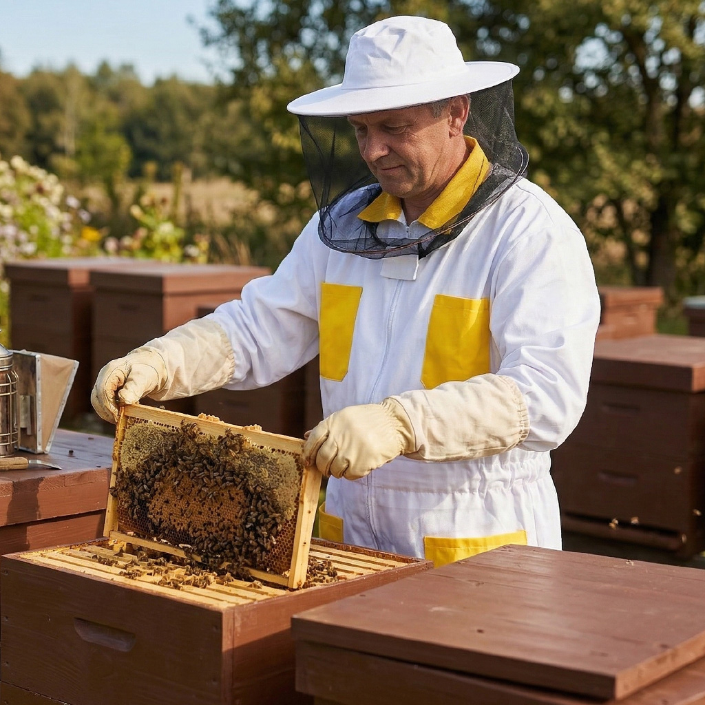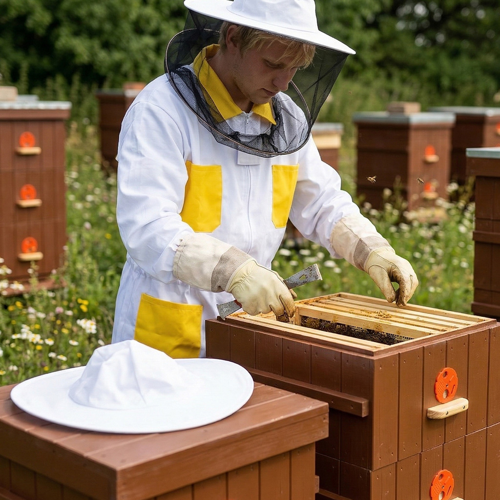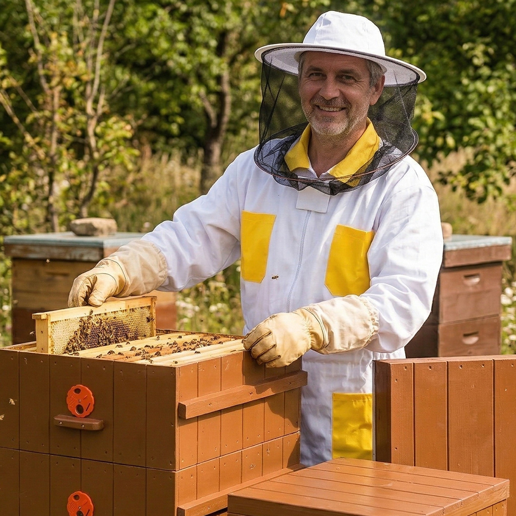 3. Für den Betrieb am Bienenstand geeignete Farbe: Die Kombination aus Weiß und Gelb wirkt neutral und reizt die Bienen nicht unnötig. Dies hilft, einen ruhigeren Arbeitsablauf aufrechtzuerhalten.