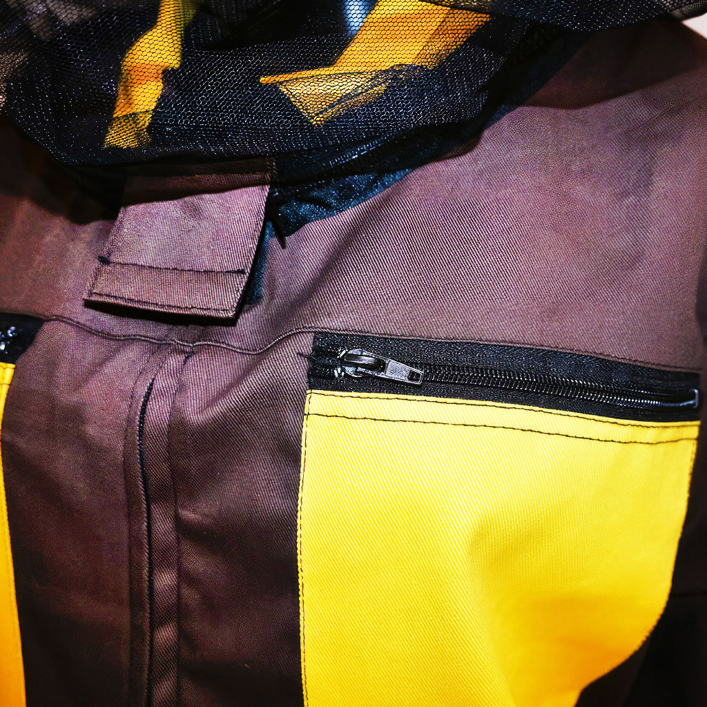 Die Bluse ist aus festem Baumwoll-Steifgewebe genäht, das seine Form gut hält und eine wirksame Barriere gegen Stachel bei der normalen Handhabung der Bienen bildet. Der Schutzhut ist mit der Bluse durch einen abnehmbaren Reißverschluss verbunden – während einer Pause können Sie ihn einfach abnehmen, ohne die gesamte Jacke ausziehen zu müssen. Im Halsbereich sind Schutzelemente für höhere Sicherheit in einem der empfindlichsten Körperbereiche angebracht.