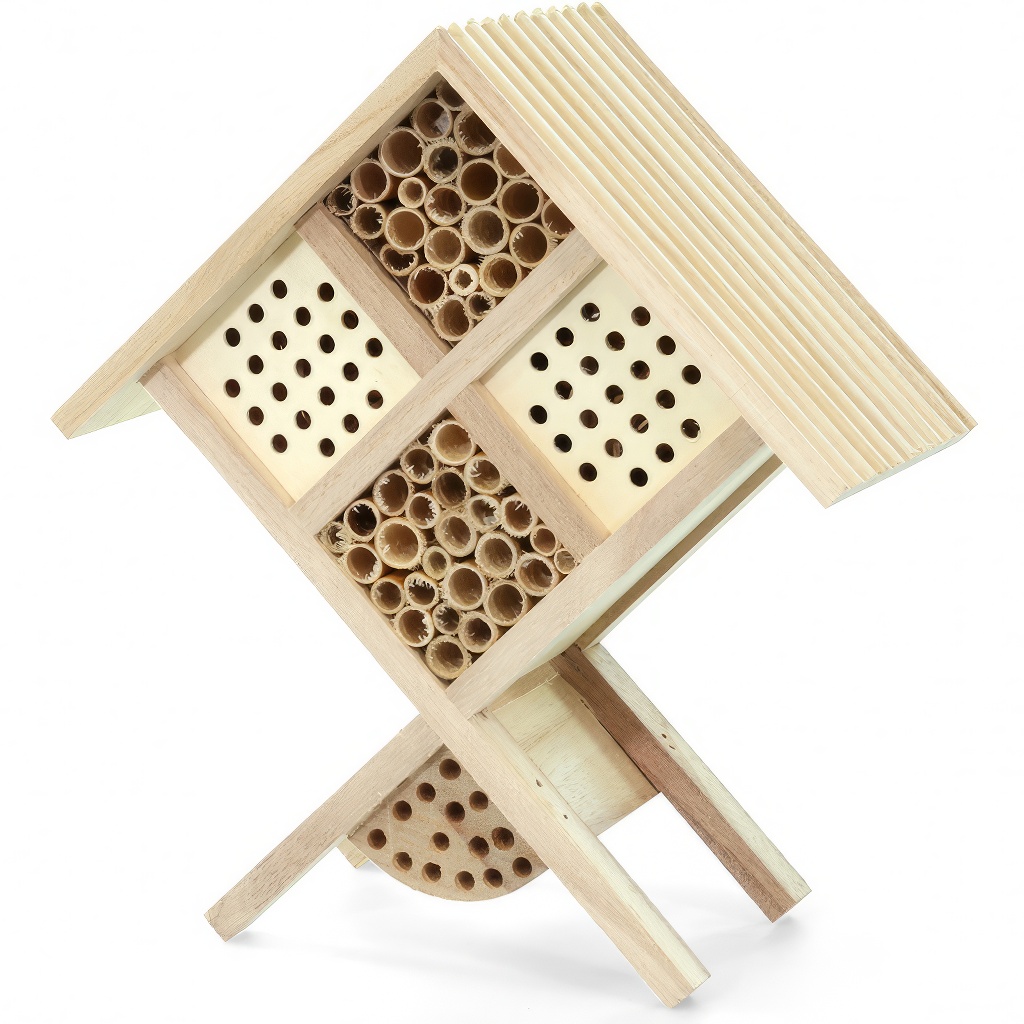Geeigneter Unterschlupf für Wildbienen, Schlupfwespen, Florfliegen und Marienkäfer. Hergestellt aus natürlichen Materialien wie Holz und Bambus.
