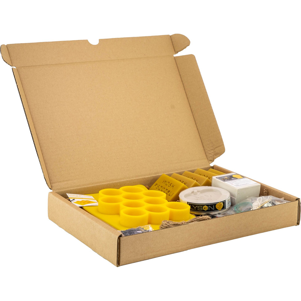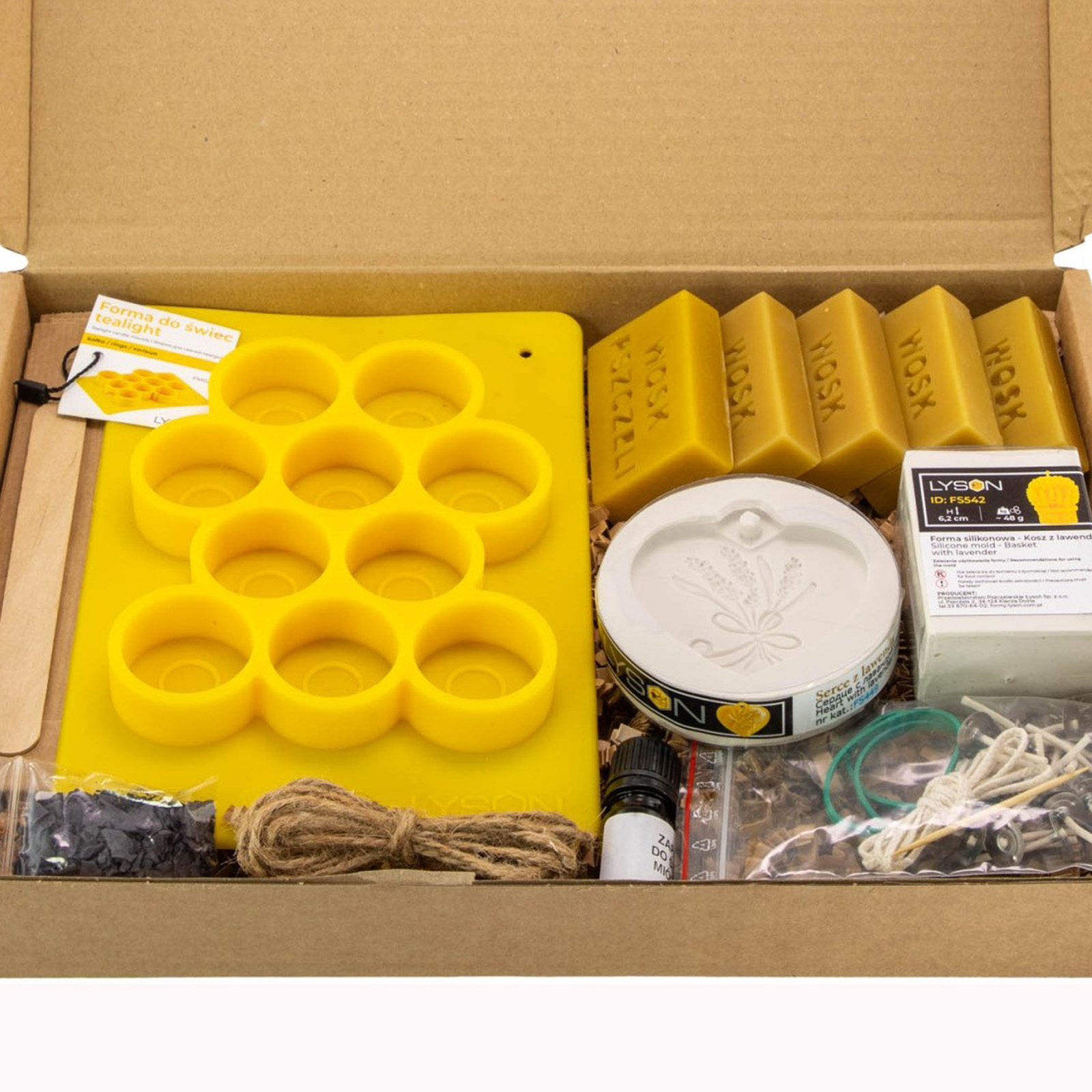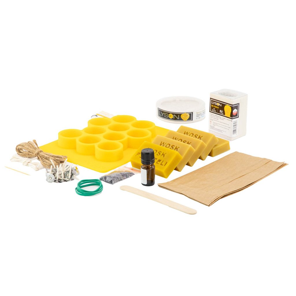 In der Verpackung finden Sie alles, was Sie für den sofortigen Start Ihres Imker-Schaffens benötigen: 250 g reines Bienenwachs (aufgeteilt in 5 Blöcke à 50 g), drei verschiedene Formen (Teelicht, Silikon-Lavendelkorb und Lavendelherz), violette Farbe für ein authentisches Aussehen und 5 ml reines Lavendel-Duftöl. Wir haben auch die technischen Details nicht vergessen: einen Meter Baumwolldocht, 20 fertige Dochte mit Plättchen, einen Holzspatel, einen Zahnstocher, Gummibänder zur Fixierung der Formen und dekorative Elemente wie Juteschnur, Geschenksäckchen und Papierfüllung.