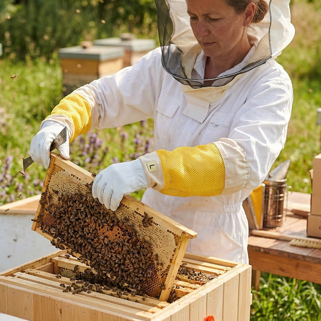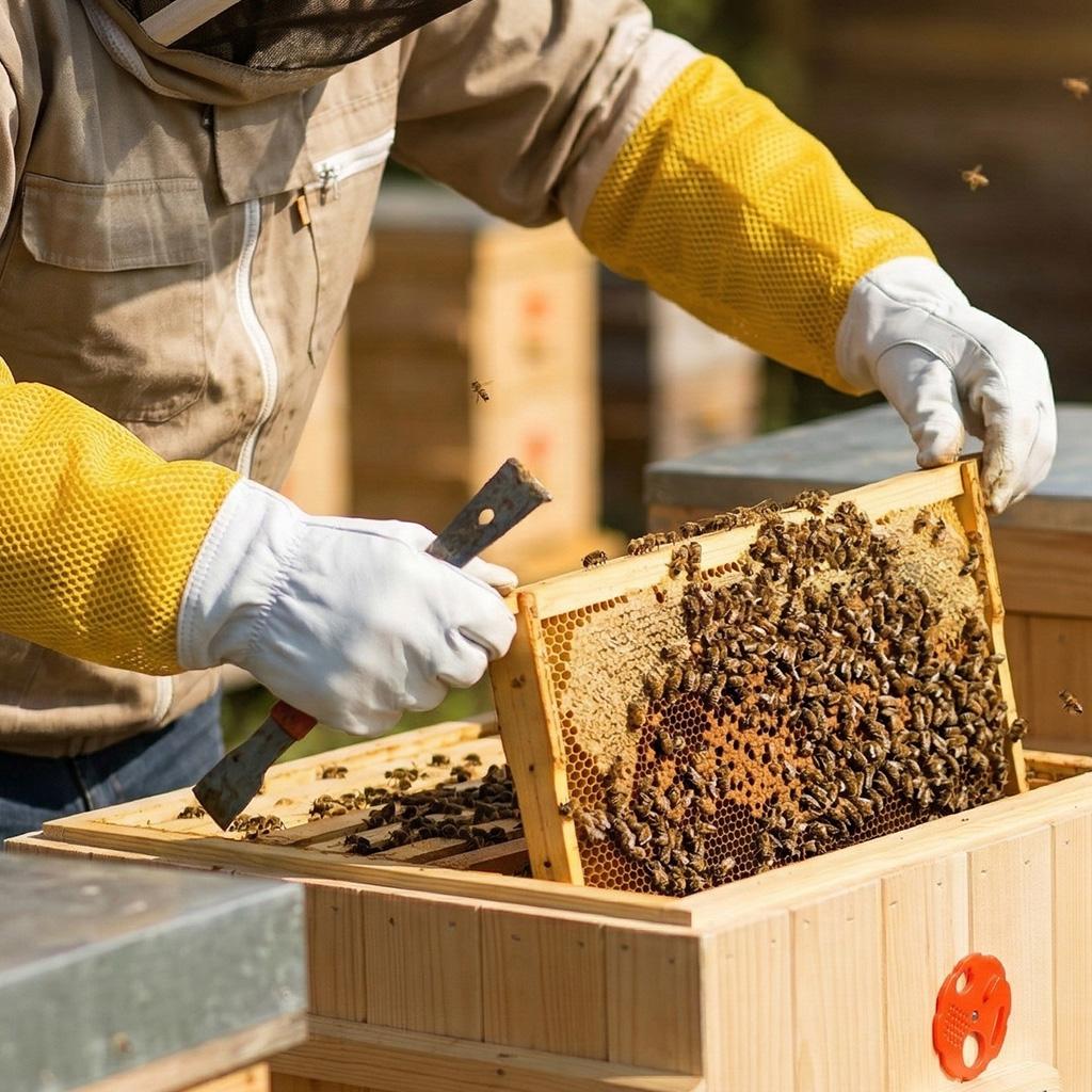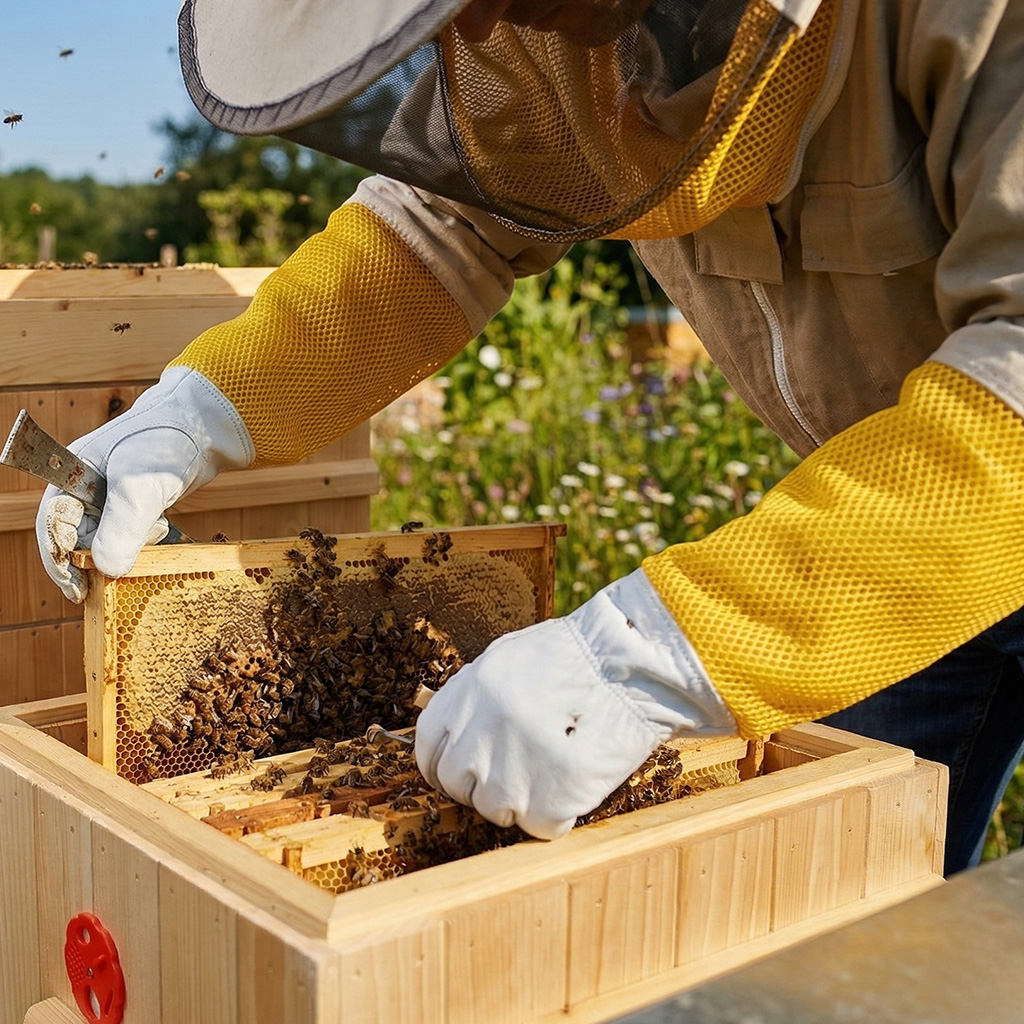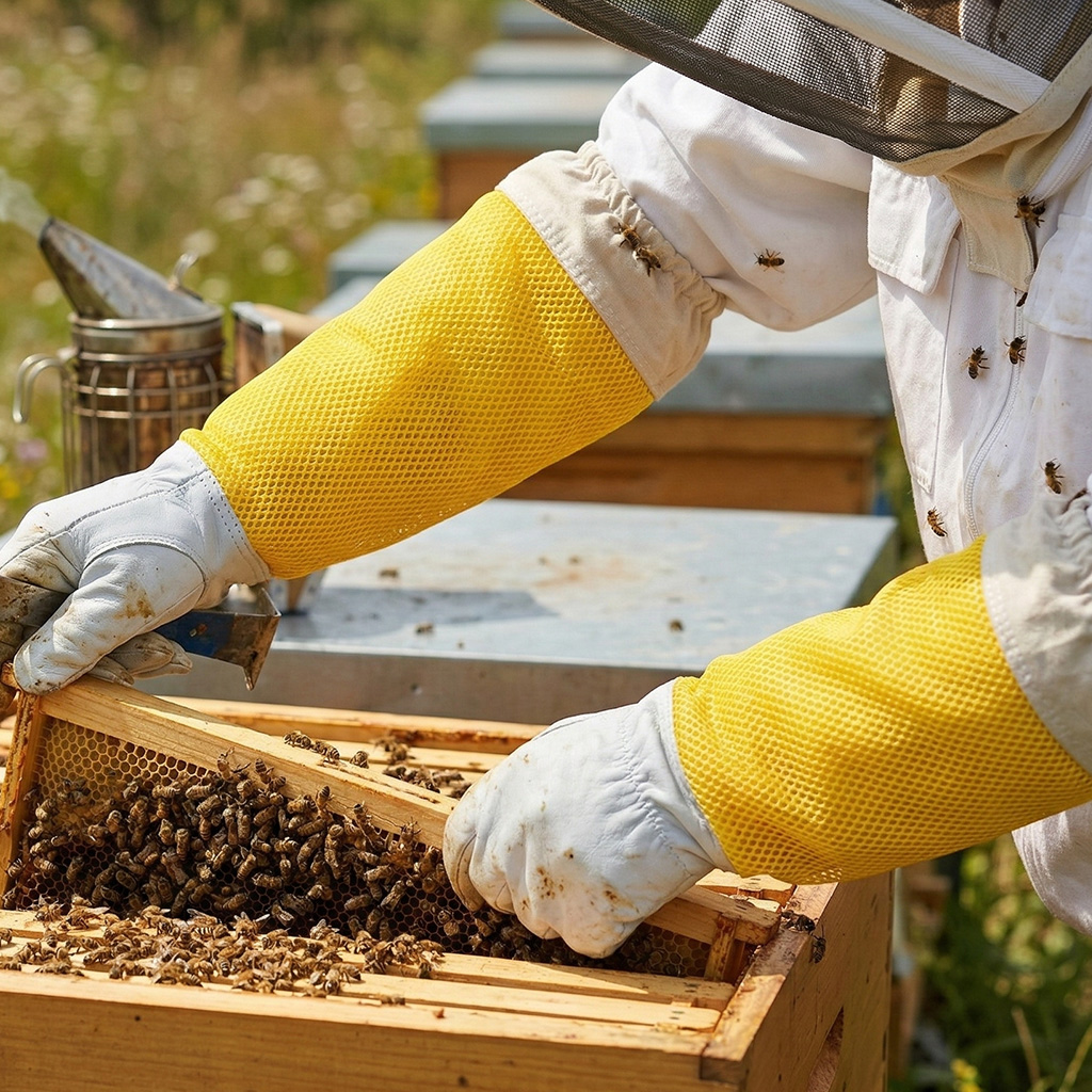 Ob Sie gerade mit der Imkerei beginnen oder bereits Jahre Erfahrung haben, das Ziel ist es, ruhig und ohne unnötigen Stress am Bienenvolk zu arbeiten. Wenn sich der Imker sicher fühlt, kann er leichter einen fließenden und sanften Arbeitsstil beibehalten – und verringert damit auch das Risiko einer Aufregung der Bienen. Ziegennarbenleder wird von Imkern für die ideale Kombination aus Widerstandsfähigkeit und Sensibilität geschätzt: Das Material ist dicht genug, um das Eindringen des Stachels zu erschweren, und bietet gleichzeitig ein gutes Fingerspitzengefühl. Durch die bessere Griffkontrolle wird das unbeabsichtigte Quetschen von Bienen bei der Handhabung der Rähmchen minimiert, was hilft, die Freisetzung von Alarmpheromonen und die darauffolgende Abwehrreaktion des Bienenvolks zu begrenzen. Die Handschuhe sind auch praktisch bei der Verwendung gängiger Imkerwerkzeuge wie Stockmeißel oder Bienenbesen.