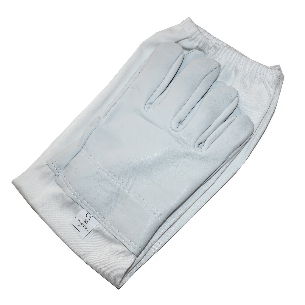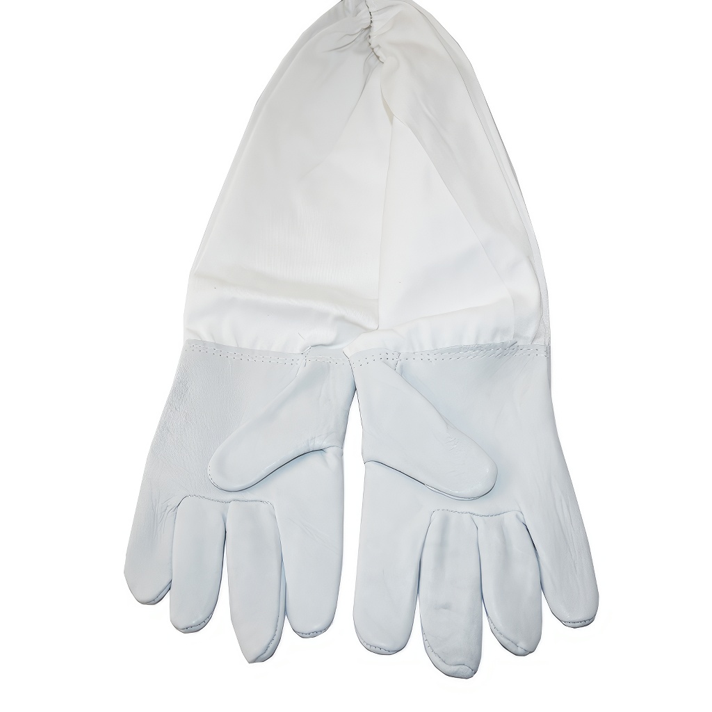 Die Handschuhe schützen nicht nur Handflächen und Finger, sondern auch den Handgelenksbereich und einen Teil des Unterarms, wo Bienen oft versuchen, einen Weg unter die Kleidung zu finden. Der Lederteil geht nahtlos in eine verlängerte Stulpe aus festem Baumwollstoff über, die widerstandsfähig und gleichzeitig atmungsaktiv ist. Die Enden der Stulpen sind mit einem Gummizug versehen, sodass sie gut an der Hand oder am Ärmel des Imkeranzugs anliegen und helfen, das Eindringen von Bienen unter den Ärmel zu verhindern.