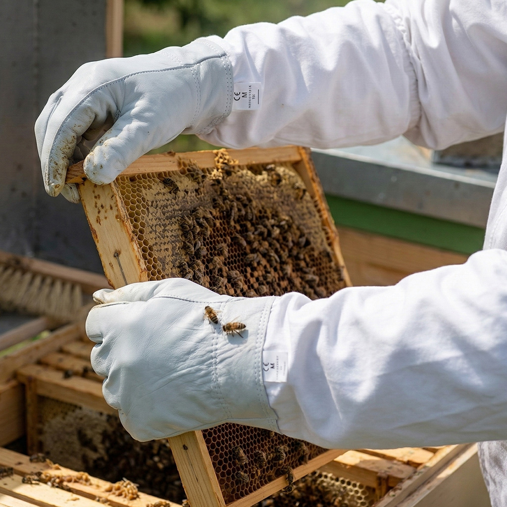 Die Imkerei ist ein wunderschönes Handwerk, das jedoch eine ruhige Hand und Sicherheit bei der Arbeit am Bienenstock erfordert. Damit die Handhabung im Bienenstand für Sie angenehm und ohne unnötigen Stress durch Stiche ist, sind Leder-Imkerhandschuhe aus Ziegenleder (Narbenleder) eine praktische Ausrüstung. Sie bieten ein ausgewogenes Verhältnis zwischen zuverlässigem Schutz und Erhalt des Fingerspitzengefühls bei der Arbeit mit Rähmchen, Stockmeißel oder Bienenbesen.