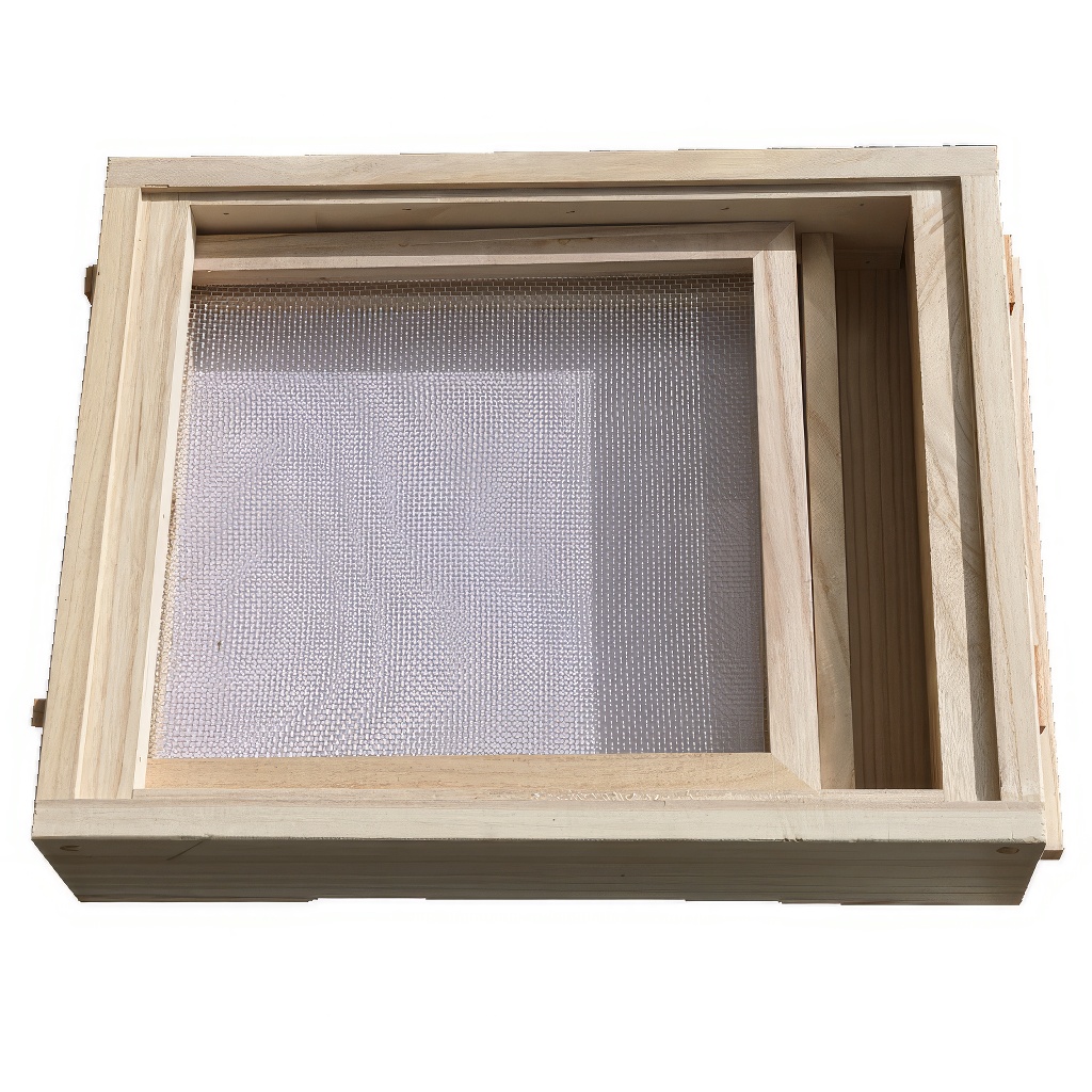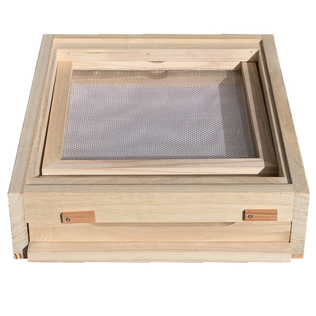 Ein Lüftungsgitter aus Edelstahl im Holzrahmen und eine herausziehbare Schublade zur Kontrolle des Milbenfalls. Einschiebbare Kassette, variabel verwendbar z.B. von hinten, oben oder unten.