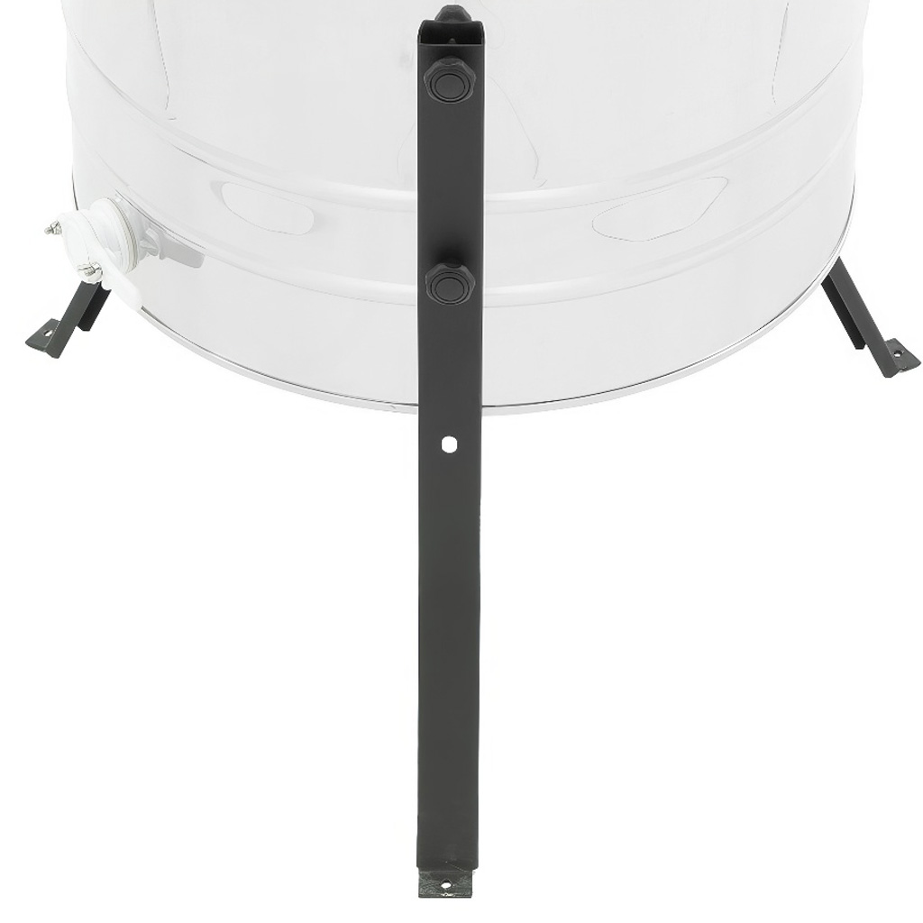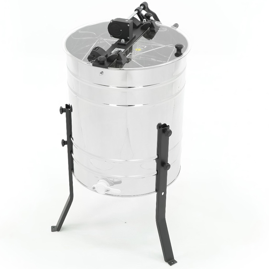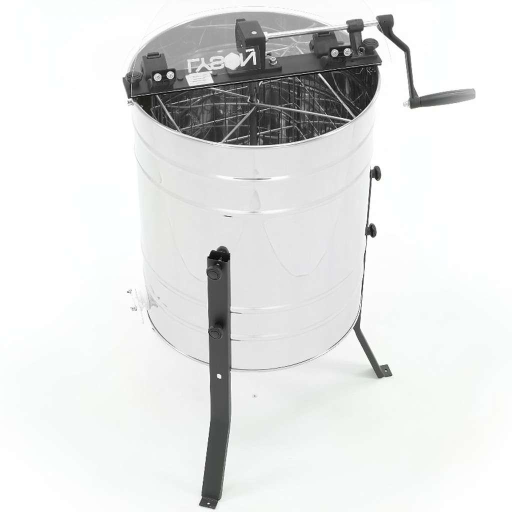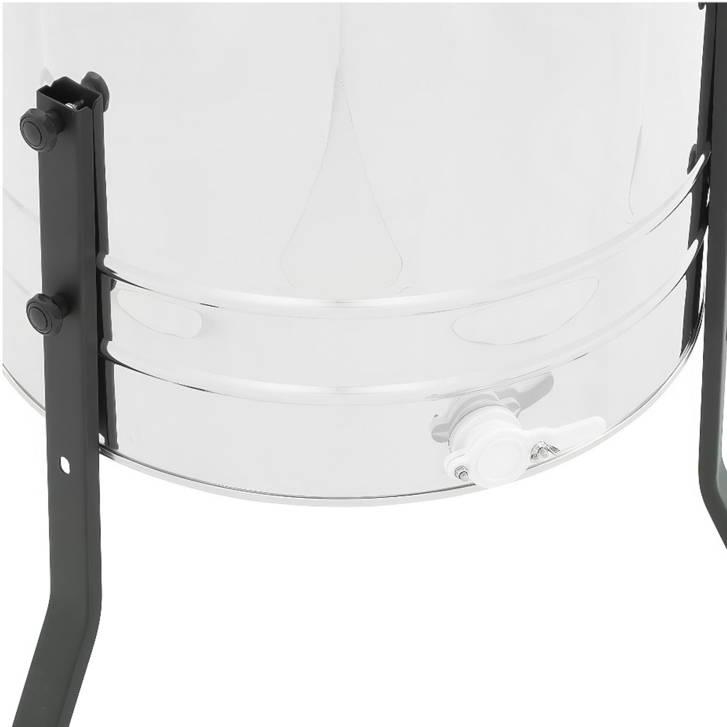 Das Tangential- (Diagonal-)Schleuderverfahren ist ein bewährter Klassiker: Die Rähmchen müssen während der Arbeit manuell gedreht werden, dafür erhalten Sie jedoch eine einfache Konstruktion und ausgezeichnete Kontrolle über den Schleudervorgang. Der leichte Gang und die ergonomische Kurbel mit integrierter Bremse am oberen Träger ermöglichen eine stufenlose Drehzahlregelung und schonende Schleuderung auch von empfindlichem Jungfernwachs oder schwereren Honigtauwaben. Der dicht geflochtene Korb (Maschenweite 25 × 70 mm) hält die Waben fest, wodurch das Risiko eines Wabenbruchs verringert wird. Praktisch ist auch die Positionierung des Kunststoff-Ablasshahns 6/4" in einer Höhe von 36 cm über dem Boden – unter die Schleuder können Sie so problemlos die meisten gängigen Abfüllbehälter und Honiggefäße stellen, ohne kompliziertes Unterlegen.