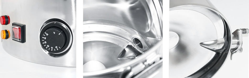 Der entscheidende Vorteil ist die integrierte Heizung – eine Heizspirale mit Thermostat hält den Honig in optimaler flüssiger Konsistenz, wenn er zu kristallisieren beginnt oder die Umgebung im Schleuderraum kühler ist. Dank der kontrollierten Erwärmung fließt der Honig besser durch den Hahn, das Abfüllen verläuft reibungsloser und die Arbeit geht schneller von der Hand. Alle Verbindungen sind präzise durch Plasmaschweißen verarbeitet, wodurch glatte Innenflächen entstehen und das Risiko von Verschmutzungsablagerungen minimiert wird.
