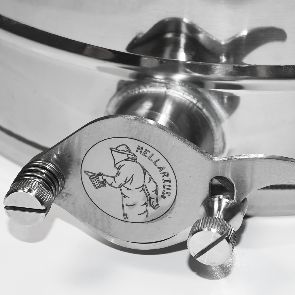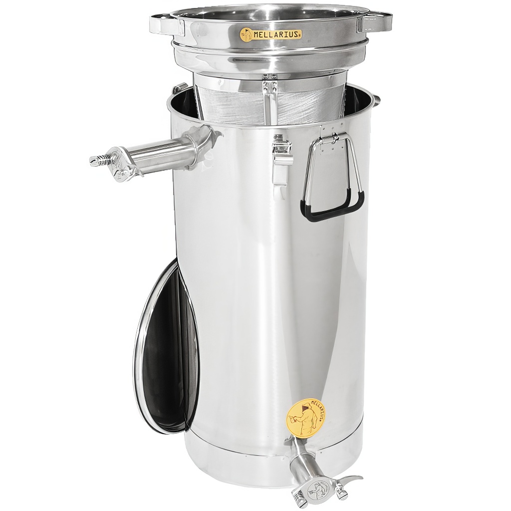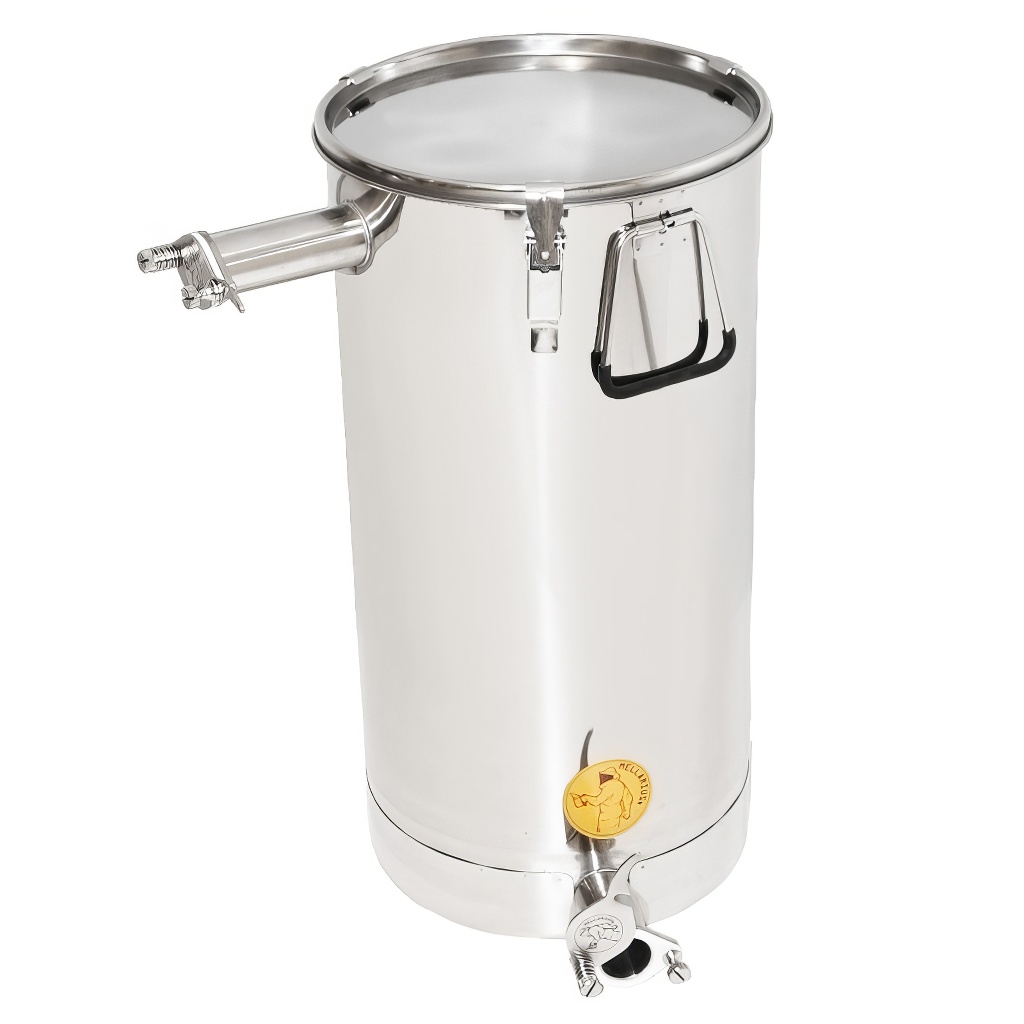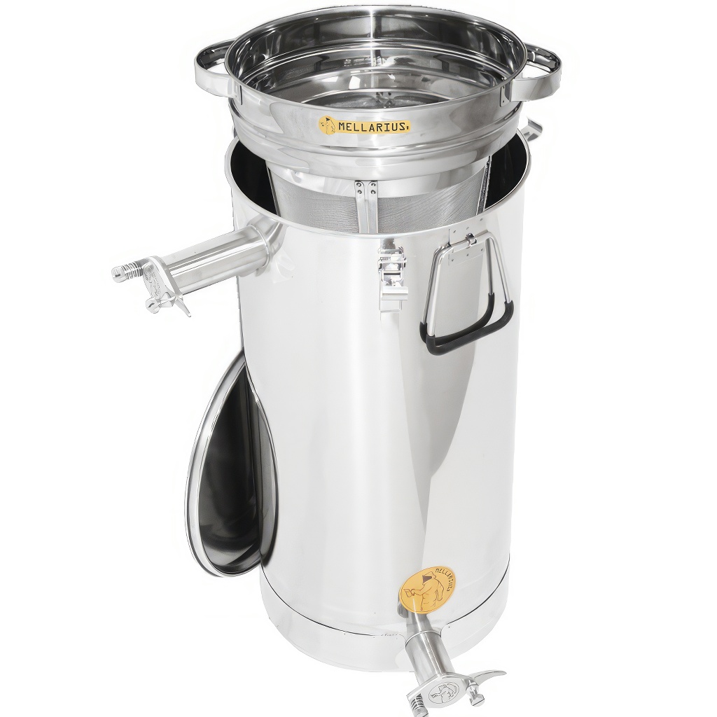 Honigbehälter Mellarius in mehreren Varianten, in diesem Fall mit geneigtem Boden, Dichtdeckel und zwei angeschweißten Edelstahlhähnen, die es ermöglichen, den Behälter als Klärbehälter für Honig zu verwenden. Sie werden aus hochwertigem Edelstahl für Lebensmittelzwecke in ausreichender Stärke (0,8 bis 1 mm) hergestellt, so dass es nicht einfach zu ungewollten Verbeulungen kommen kann. Alle Teile der Behälter sind hochwertig mit Hilfe von Plasmaschweißen verschweißt. Bei der Konstruktion wird Wert auf glatte Oberflächen gelegt, die sich leicht reinigen lassen, daher sind die Behälter aus polierten Edelstahlblechen hergestellt. Alle unsere Behälter sind mit Edelstahlgriffen für einfachen Transport ausgestattet. Im Lieferumfang ist auch ein Edelstahlsieb enthalten, das Sie in den Behälter einsetzen und mit Hilfe des oberen Hahns als Klärbehälter nutzen können.