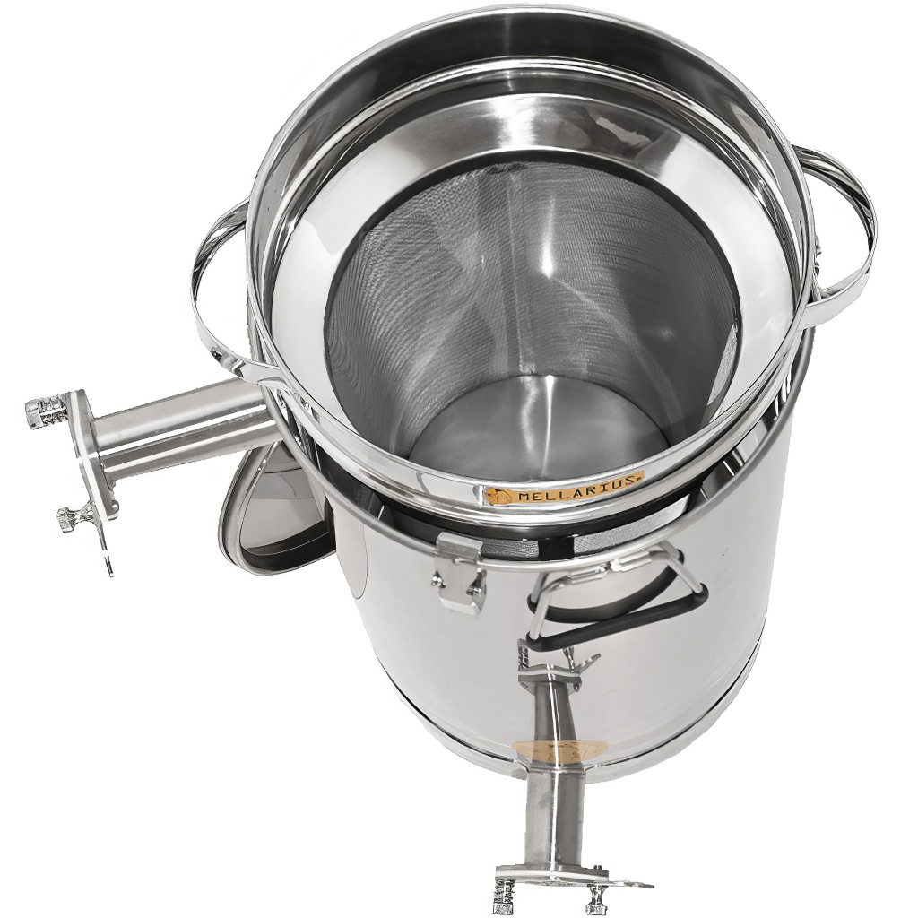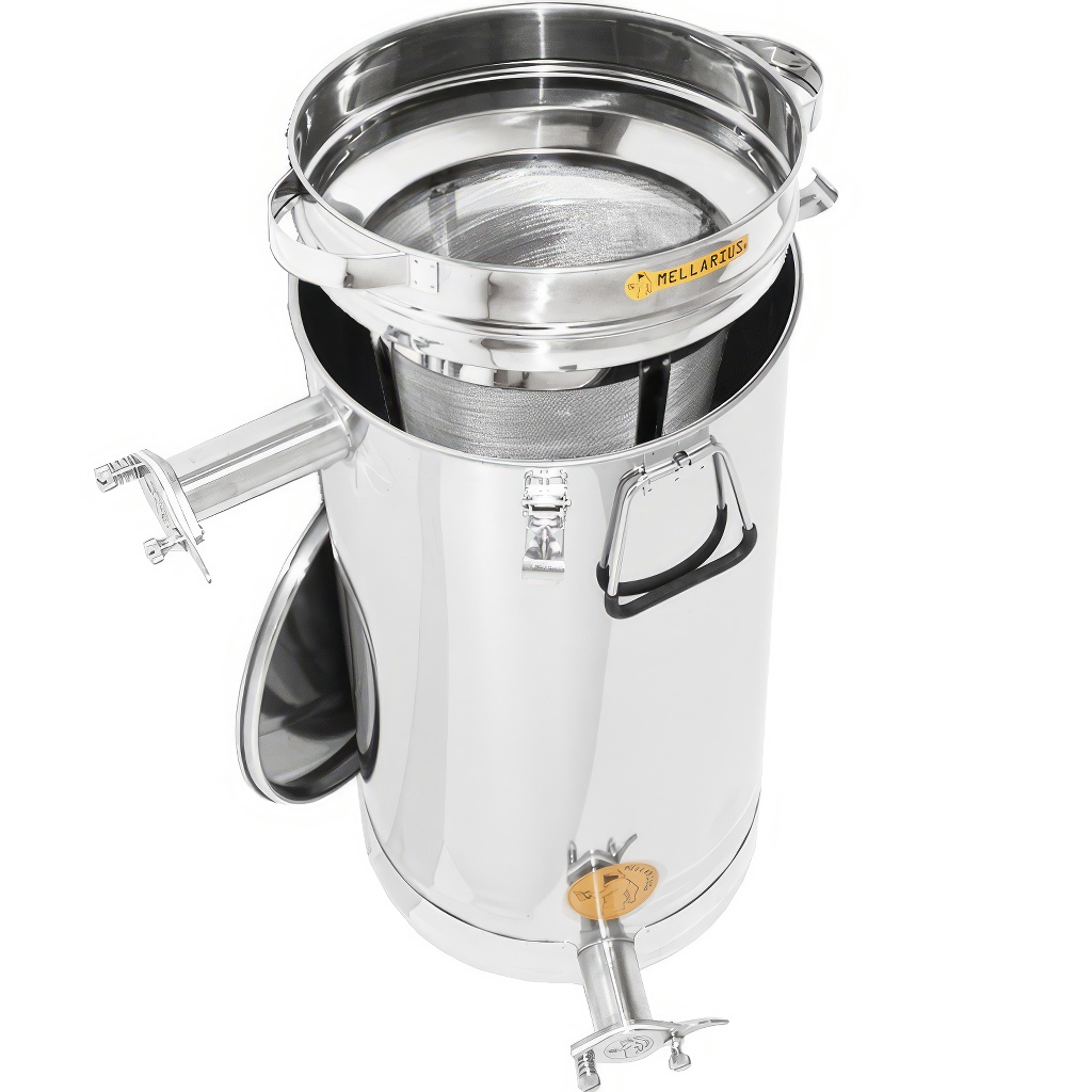 Bestandteil des Behälters ist ein konisches Sieb, dank dem Sie ihn als Klärbehälter betreiben können. Zu den Behältern stellen wir passende Edelstahlsiebe her, die genau auf die Behälter passen. Wir bieten sie in drei Feinheiten (grob, fein, ultra fein) an, die beliebig aufeinander gestapelt werden können (nicht im Lieferumfang enthalten, muss zusätzlich gekauft werden). So kann man eine Kombination aus grobem und feinem Sieb erhalten. Zu den Honigbehältern bieten wir auch passende Edelstahlständer an, dank denen unter dem Behälter ausreichend Platz ist (nicht im Lieferumfang enthalten, muss zusätzlich gekauft werden). Die Behälter können auch mit präzisen Ablassventilen ausgestattet werden, die direkt auf den Edelstahl-Ablasshahn montiert werden (nicht im Lieferumfang enthalten, muss zusätzlich gekauft werden).