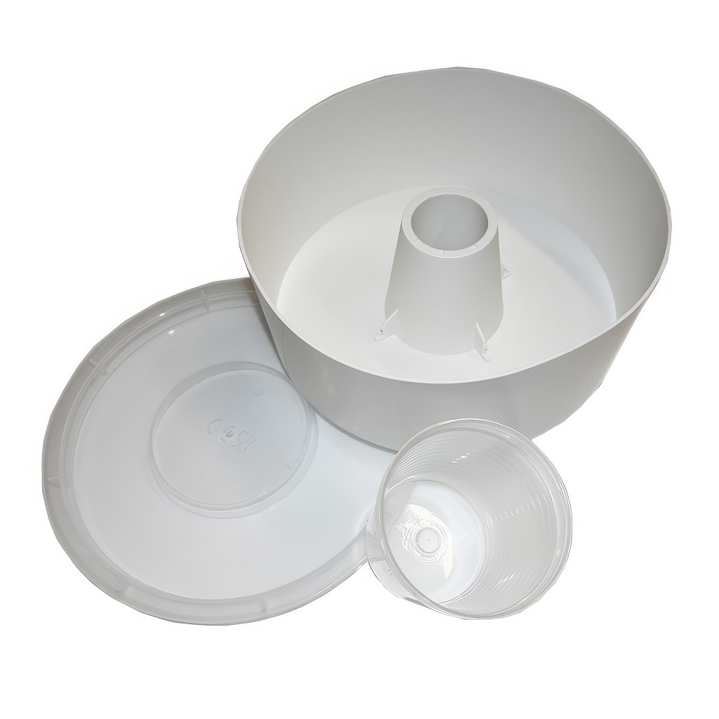 Kunststoff-Futtertrog mit einem Volumen von 1,8 Litern zur Zufütterung von Bienen. Seine Verwendung ist sehr einfach: Auf den letzten Aufsatz setzen wir ein Zwischenbrett mit Öffnung oder einen leeren Aufsatz mit Sololit-Einlage. Auf das Loch im Sololit (Zwischenbrett) stellen wir diesen Futtertrog, dessen Öffnung wir mit einer durchsichtigen Abdeckung und einem Deckel verschließen. Dadurch, dass die Abdeckung aus dichtem Material besteht, hebt sie sich nicht an und muss daher nach dem Eingießen der Futterlösung nicht beschwert werden.