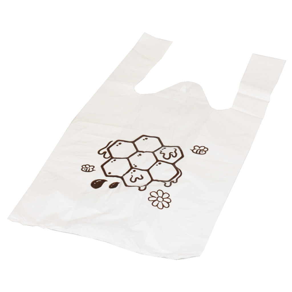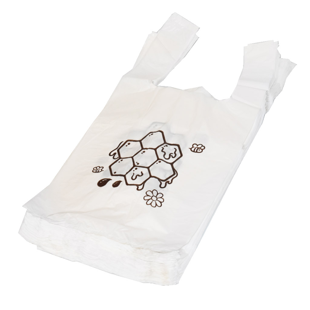 Plastiktüten mit langen Henkeln mit Wabenmotiv, verpackt zu je 50 Stück. Größe ca. 22×38 cm.