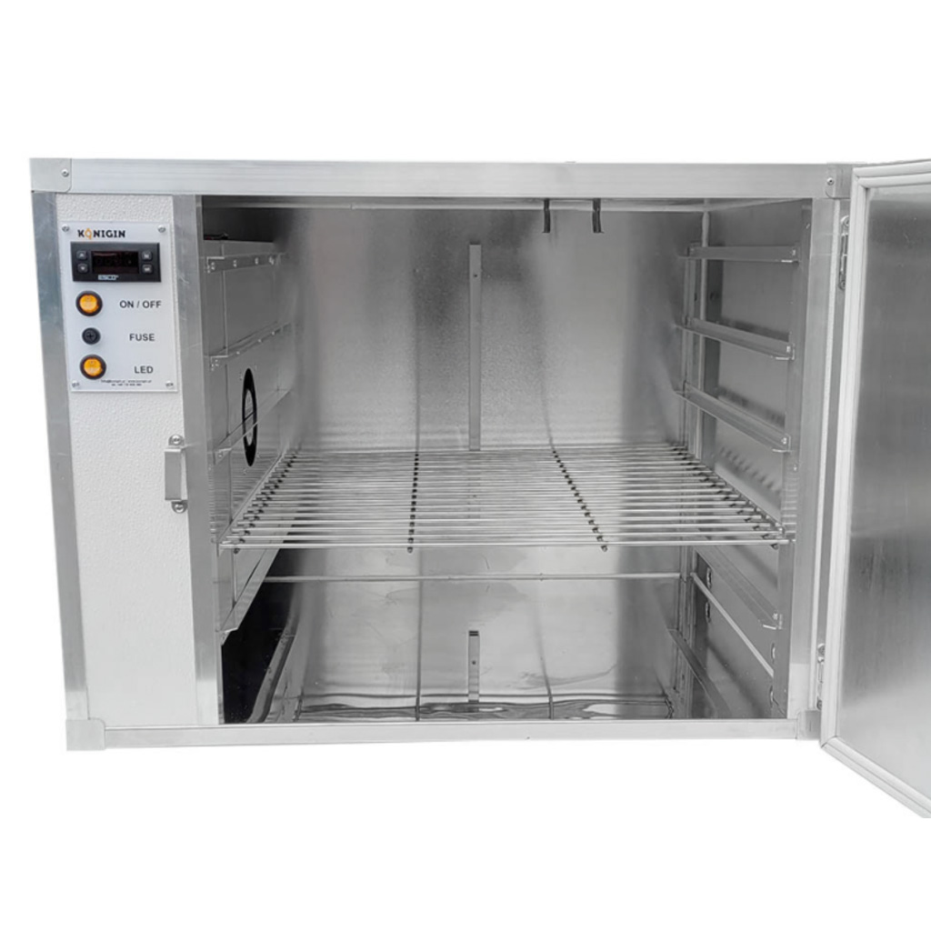 Die Beheizung erfolgt durch ein Heizelement zusammen mit Ventilatoren, die die Wärme im gesamten Kammerraum verteilen, sodass die Dekristallisation gleichmäßig erfolgt. Ein großer Vorteil ist die verglaste Tür mit Doppelverglasung und LED-Innenbeleuchtung – Sie können den Fortschritt der Honigverflüssigung jederzeit beobachten, ohne unnötig zu öffnen. Dadurch begrenzen Sie Wärmeverluste und tragen zu einem sparsamen Betrieb bei (Verbrauch ca. 0,13 kWh). Je nach aktuell gelieferter Variante kann die Kammer 1 bis 2 Belüftungsöffnungen haben; bei der Dekristallisation selbst bleiben diese geschlossen, damit die Wärme nicht unnötig entweicht.
