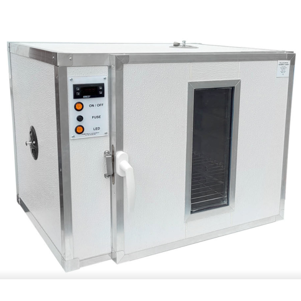 Die Kammer dient nicht nur zur Honigverflüssigung – bei Einstellung niedrigerer Temperaturen können Sie sie auch zum schonenden Trocknen von Bienenpollen nutzen. Für die Dekristallisation werden üblicherweise 40–50 °C empfohlen, für Pollen in der Regel 35–40 °C (je nach Art und gewünschtem Ergebnis). Zum Trocknen können Holz- oder Edelstahlschubladen nachgekauft werden (je nach Ausführung passen 5 oder 10 Schubladen hinein). In der Grundausstattung ist ein herausnehmbarer Edelstahlrost enthalten; durch Nachkauf eines weiteren Rostes erhöhen Sie die Kapazität auf bis zu 75 Stück 1-kg-Gläser mit Honig.